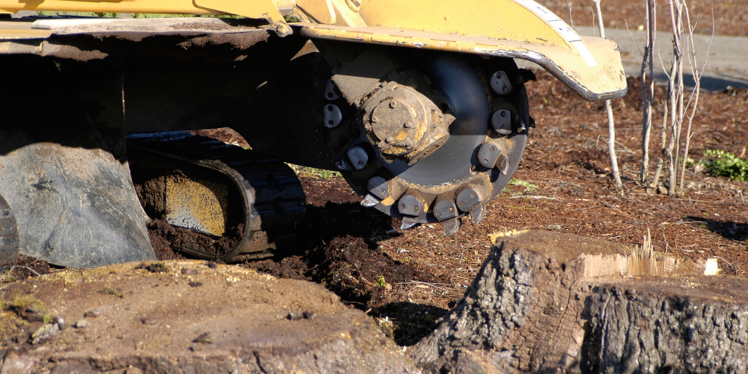 Eine Fräse zerkleinert den Baumstumpf maschinell bis knapp unter die Erde.